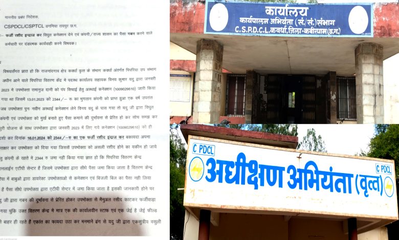 वर्तमान मामला पिपरिया विद्युत विभाग का है जिसमें बाबू विनय कुमार द्वारा उपभोक्ताओं को फर्जी रसीद बनाकर मोटी रकम वसूल कर कंपनी वह उपभोक्ताओं को करोड़ों का चूना लगाया जा रहा है रशिद में बकायदा अपना हस्ताक्षर कर उपभोक्ताओं को दिया जाता है एवं पैसा विभाग में जमा न कर अपने व अपने सहयोगी अधिकारियों को देता है रसीद का पैसा विभाग के खजाने में जमा ना होने की शिकायत कवर्धा जिले के आला अधिकारियों से करने पर शिकायत के 10 दिन बाद भी कोई कार्यवाही नजर नहीं आ रही अलबत्ता शिकायत उपरांत भी विनय यादव जी पिपरिया में पदस्थ हैं
