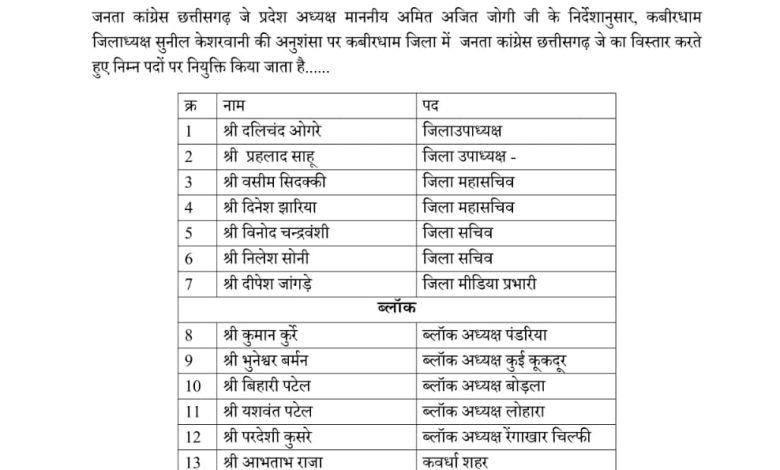 जनता कांग्रेस छत्तीसगढ़ जे ने जिला मे कार्यकरणी का किया विस्तार